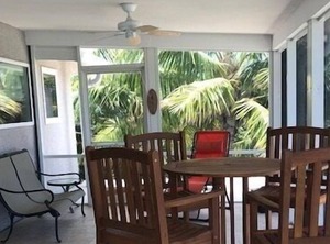 The modern chef's kitchen has a granite island with 4 swivel bar chairs. Stainless steel appliances in the kitchen include a French door refrigerator with water/ice maker on front, a ceramic stove top/oven with hood microwave, and dishwasher. The dining area features a 60' glass table with 4 comfortable chairs. Another high top dining table with 4 chairs is located on the screened lanai.