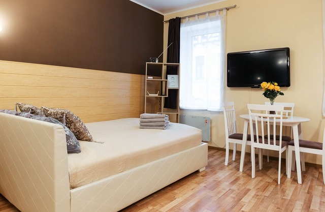 Apartment is equipped with all necessary for convenient stay – very comfy king size bed and two wide sofa beds with bed linen, interactive TV with multinational 135 channels, fast Wifi internet, all what’s needed for food preparation and cooking, iron, washing-machine with laundry drier, toddler bed, full sets of bedding, towels and things for daily hygiene.