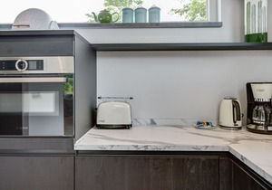 Layout: Ground floor: (open kitchen(hob(induction), electric kettle, toaster, coffee machine(cups, filter), combination microwave, dishwasher, fridge-freezer, Juicer), Living/diningroom(TV(flatscreen, smart TV), dining table(6 persons), seating area(6 persons)), Bedroom with bathroom(single bed(boxspring, 90 x 210 cm), single bed(boxspring, 90 x 210 cm), bath tub, shower(walk-in shower)), toilet)