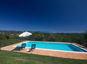 A 2-room apartment with an area of 50 square meters is located on the ground floor. It features a living/sleeping room with a double sofabed, a fold-away bed, satellite TV, and a flat screen. There is an exit from this room leading to the swimming pool. Additionally, there is one room with a double bed.