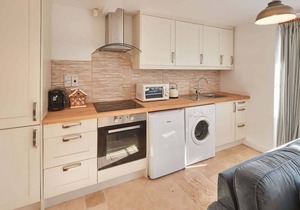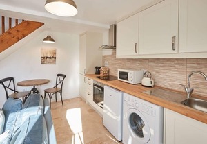 Fully equipped for all stays, the kitchen boasts a fridge freezer, microwave, oven, hob, kettle and toaster. With light blue cabinets, light wooden worktops and quirky tiles, this space is seriously stylish.
