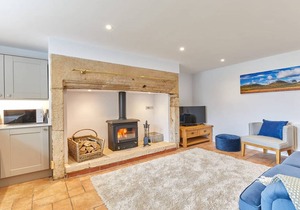 Maggie’s has a bright open plan living, kitchen and dining area. With a sandstone inglenook fireplace with wood burning stove, it’s the perfect spot to cosy up and unwind. Relax on the blue velvet sofa and turn on the flat screen TV to enjoy a quiet evening in. Shaker in style, the light grey kitchen is fully equipped with everything you could need to prepare meals easily. The dining area features a rustic style round dining table and two matching chairs.
