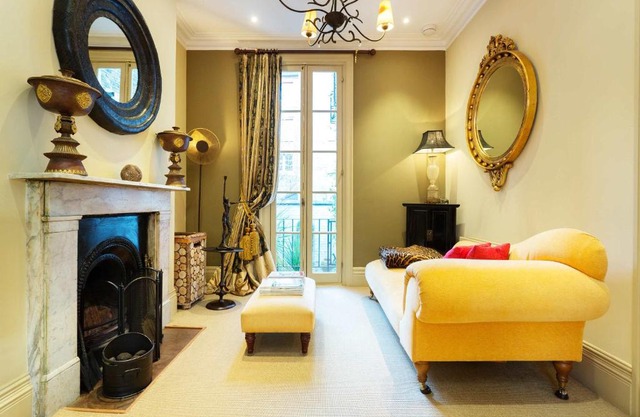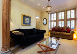 The kitchen and dining area is located in the lower ground floor, down a flight of stairs from the entrance level. The kitchen area has a beautiful and unique circular design and is fitted with gas hobs, oven, fridge, freezer, microwave and dishwasher. The dining table sits 6-8 people next to which is a large corner sofa and a fireplace, perfect for relaxing with friends and family after a meal.