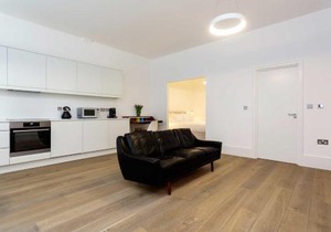 Enter the apartment onto a large open plan living room and kitchen area. With lots of space and wooden floors through, this home has monochrome furnishings. With a large black leather sofa, a television on the wall, there is a desk with chair in the corner of the room. By the window, there is a table and chairs for dining. The kitchen comprises everything you will need during your stay, including an oven with induction hob, microwave, coffee machine and fridge/freezer. There is also a dishwasher and washing machine.