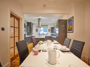 At the beating heart of this property is the combined kitchen and dining room. Dominating the kitchen is the centre island, with fine, white worktops spreading out across it and the surrounding kitchen. The island also houses the electric hob on top of it and the extractor fan above. Circling the island are the other worksurfaces, as well as the drawers and cupboards that house all the cutlery and dinnerware you will need. The kitchen also offers two electric ovens, fridge and freezer, toaster and kettle. Across from the Kitchen is the dining room, which has space and chairs to seat six people comfortably for comfort dining as you admire the decorations across the walls.