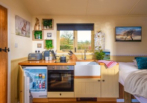 Bathroom: Roll Top Bath, Toilet. Electric central heating, electricity, bed linen and towels included. Decked area. Ample private parking. No smoking.. A luxury romantic retreat set in the Heart of the Worcestershire Countryside, quoted as one of the top 10 Glamping sites in the UK by the Guardian newspaper. Monkwood is a lovingly crafted shepherd’s hut for couples, offering a luxury hideaway for special short breaks. Wake up in your king-sized double bed, light the wood burner and relax over breakfast in the comfortable high-quality interior. The superb luxury bathroom with a roll-top copper bathtub is truly indulgent, just the place to have a long chill out soak after a day exploring the nearby ancient woodlands, local towns, and villages. Monkwood really does offer a unique and memorable glamping experience in a tucked-away location, boasting magnificent views of the surrounding open countryside.