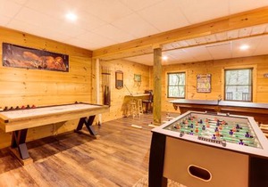 INDOOR LIVING: 4 Smart TVs, dining table, electric fireplace, game room w/ pool table, air hockey table, foosball & ping pong, vaulted ceilings, open floor plan