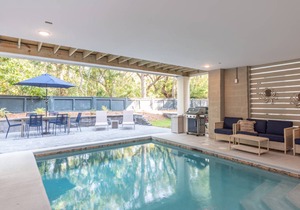 Starting on the ground level, the home features a large garage under the house with a beach cart, beach chairs, and large trunk full of kids beach and pool toys. There is also a large ping pong table! The back of the ground level under the home overlooks the lagoon filled with turtles and visits from other wildlife. There is a gorgeous sparkling private pool that is kept heated year-round. The pool is surrounded by plenty of seating with an outdoor sofa, chairs and a high top dining table. There is also an outdoor shower for rinsing off after the beach. The large paver patio with sitting wall extends off the back of the pool and features a Weber grill.