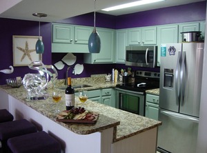 The living room has a queen sleeper sofa so that you can accommodate more guests if needed. There is a 50” TV with DVD player in the living room. The living room contains modern comfortable furniture for you to unwind in from the beach. The dining room has a marble table and leather chairs that seats four. There are 3 barstools at the kitchen bar to add to the eating space. The kitchen has all the amenities you will need for a great stay. The stainless appliances and granite countertops make cooking in the kitchen more than a chore. There is free WIFI high speed internet throughout the unit that you will be able to access just in case you need to do some work during your stay at the beach. The entire condo is done in bold and bright colors to make your stay in Hyperion Tower a memorable one.