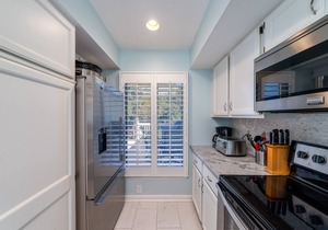 714 Spinnaker has been remodeled with a gorgeous kitchen which opens into the living area. Updates include granite countertops and appliances as well as linens, towels and sofas.