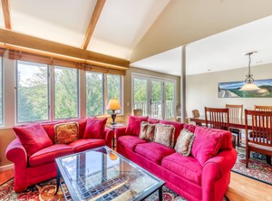 Situated on a lower level, this unique condo is full of charm with color-splashed furnishings, mountain home decor, and modern comforts like free WiFi, flatscreen television, and updated appliances, including a dishwasher. Kick off your hiking boots and rest on comfortable couches in the living area, or head into the well-equipped kitchen to whip up a hearty, homemade meal. Walk onto the outdoor porch to take in the gorgeous rolling mountain views at sunset, then retire for restful slumber in any of three bedrooms welcoming up to six guests.