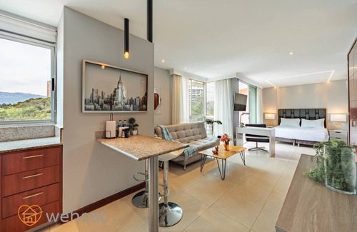 Feel like a star in this stunning studio, perfect for both short and long stays. Located on the 11th floor of the Blux building, you'll wake up to the best view of the city, knowing you have everything you need to make your stay comfortable and enjoyable. Decorated with elegant tones of black and white, and perfect touches of color and metal, you'll enjoy a unique space in Medellín.