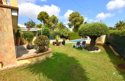 Fully equipped kitchen with ceramic hob, oven, dishwasher, microwave, kettle, coffee maker, toaster and 2 fridge / freezers. Utility-room with washing machine, tumble dryer and sink. Private swimming pool of 8x4m. Terrace next to the swimming pool with 8 sun loungers, barbecue, parasol, sofa and 2 armchairs. rent holiday home in Jávea Well-kept garden with lawn. In the garden there is ample space for parking.