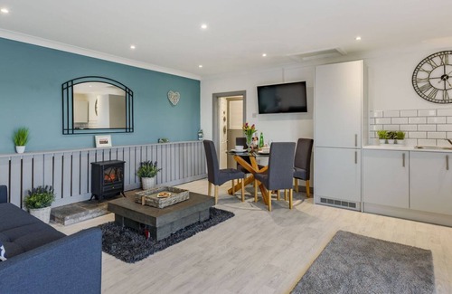 Living area: With electric fire, Freeview Smart TV, sofa bed (for flexible sleeping arrangements) and French doors leading to garden.
