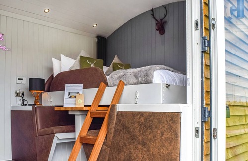 Shower room: With shower cubicle and toilet.. LPG gas central heating, gas, electricity, bed linen, towels and Wi-Fi included. Front garden with firepit and garden furniture. Private parking for 2 cars. No smoking or e-cigarettes. . This superb, handcrafted shepherd’s hut can be found in the village of Singleton, nestled near the picturesque town of Poulton-Le-Fylde. Designed to accommodate two adults and two children, it makes an ideal base for couples and small families seeking a unique getaway near the beautiful Fylde Coast. The Stags Head has been a labour of love, boasting rustic-chic décor and has been meticulously crafted with careful thought to attention and detail. Once inside you’ll be greeted by a charming interior, complete with a comfortable, raised, king size bed for the adults. Two small singles are at floor level cleverly tucked underneath the dining arrangement just perfect for little ones. During the day all beds can be hidden away leaving diner style seating for meals, games and simply spending quality time.