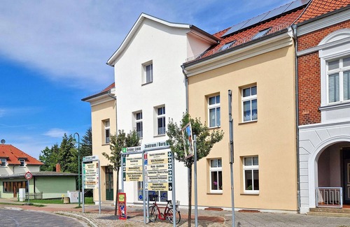 Centrally located in the centre of Wesenberg, the holiday apartment for two people is on the first floor of a residential and commercial building (hairdressing salon on the ground floor). Shopping facilities, restaurants, railway station, market square and Wesenberg Castle are within walking distance, beautiful bathing spots at the Weißensee or Woblitzsee can be reached by bike in about 5 minutes. There is a small cinema directly opposite, which is still in operation. The approx. 30 square metre non-smoking flat with separate entrance (shared corridor with the other residents) has insect screens on the windows and is centrally heated. It is tastefully furnished with a combined living room and bedroom (sofa bed, flat screen TV, visually separated sleeping area with double bed ATTENTION: narrow access to the bed!), a separate kitchen (electric cooker with oven, fridge with freezer compartment). Option, microwave with grill, pad coffee machine, kettle, fold-out dining table), a bathroom (shower, WC, hairdryer) and a small hallway. Free WLAN as well as bicycle storage and recreational facilities are also available on the approx. 800 square metre courtyard property. Public parking spaces are available in the surrounding area (approx. 100 - 500 m), for loading and unloading you can do this for a short time. The total price includes final cleaning, electricity, water costs, bed linen and towels. To be paid on site: Tourist tax. Pets are not allowed in this accommodation.