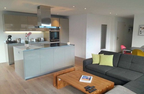 • 3.5-room apartment, 3rd floor, 130 m², elevator • Roof terrace, 4th floor, 130 m², stairs • Sleeps 4 • Sunny, central location • Panoramic view of Ascona and the surrounding mountains • Spacious roof terrace with lounge, dining table • Whirlpool, open year-round • Electric sunshade, 4 lounge chairs • Luxurious interiors • Living-dining room with sofa set, LCD TV with sound system • Dining table with 6 chairs • Exit to the balcony with lounge furniture, vertical privacy/sun protection • High-speed Wi-Fi • Designer kitchen with cooking island, modern appliances • Induction cooktop, oven, plate warmer • Dishwasher, large refrigerator • Toaster/kettle • Dolce Gusto coffee machine (please bring your own capsules) . • 1 bedroom with a queen-size bed and en-suite bathroom with shower/WC • 1 bedroom with a double bed and clothes rack • 1 additional bathroom with shower/WC and hairdryer • Large built-in wardrobes • Electric shutters on all windows • Entire apartment is air-conditioned • Washing machine/tumble dryer • 1 reserved parking space in the underground garage • Pets are not allowed • Non-smoking apartment, please smoke on the terrace • Security deposit CHF 800.00