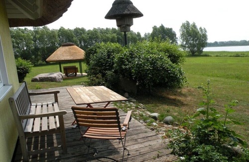 Located in a quiet location on the outskirts of the village, directly on an outskirts of the Rügen Lagoon, you'll find your oasis for exploring the holiday island of Rügen. Under new management, this modern and high-quality furnished semi-detached house offers comfort for four guests. It features two beautiful bedrooms and a bathroom on the upper floor, a living room with a modern kitchenette, a guest toilet, and a glass-enclosed entrance area on the ground floor. Satellite TV, a flat-screen TV, parking space, washing machine, and Wi-Fi are included. A maximum of one dog is permitted (subject to an additional charge) upon consultation with us. A rowing boat is available to guests free of charge and at their own risk. Guests must bring the boat to/from the house and clean it themselves.