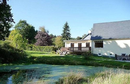 The 122 m² holiday apartment is located in a completely renovated historic mill building. Geothermal heating. Private entrance, 3 bedrooms, and 2 living rooms. Fully equipped kitchen, dishwasher, washing machine, and dryer. Wi-Fi, LED TV. Luxury amenities. A wonderful sun terrace with a barbecue grill directly on the mill pond. In spring, a sea of blossoms enchants, consisting of countless winter aconites, daffodils, snowdrops, daffodils, and primroses. The old rhododendrons are continually being supplemented by new plantings, some of which are rare. In the long term, the property will be home to a select plant collection. The ponds are home to thousands of frogs and newts during the spawning season. Black storks are a frequent visitor.