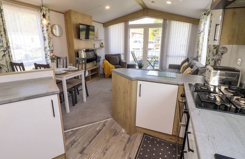 10 Woodlands Way consists of an open-plan living space including a kitchen with an electric oven, gas hob, microwave, fridge/freezer, wine chiller, a dining area, and a sitting area with Smart TV and electric fire. This single-storey property has three bedrooms: one king-size and two twins. There is a shower room with a walk-in shower, basin and WC, and a cloakroom with basin and WC. Outside, you’ll find an enclosed front garden with decking and furniture, and a non-enclosed rear garden with gravel and furniture, plus off-road parking for two cars. WiFi, fuel, power, bed linen and towels are included in rent. Sorry, no smoking and no pets. Have a splendid holiday at 10 Woodlands Way. Shop 3.6 miles, pub 0.1 mile. Note: Steps up to the property, please take care. Note: Golf and tennis courts on-site.
