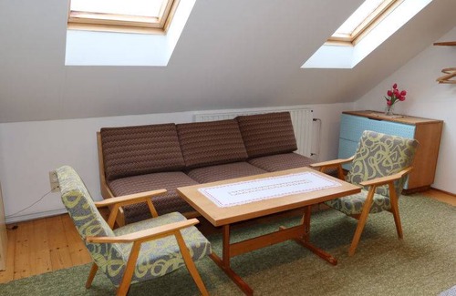 4-room semi-detached house 120 m² on 2 levels. Practical furnishings: living/dining room 30 m² with satellite TV (flat screen), radio. Exit to the garden. 1 room with 1 double bed. Kitchenette (oven, dishwasher, 4 ceramic glass hob hotplates, microwave, freezer, electric coffee machine). Bath/shower, bidet, sep. WC. Gas heating. Upper floor: walk-through room 30 m², with sloping ceilings with 3 beds (82 cm, length 192 cm), 1 sofabed (150 cm, length 200 cm). 1 room with sloping ceilings with 1 bed (82 cm, length 192 cm), 1 double bed. Exit to the loggia. Sep. WC. Beautiful view of the countryside. Facilities: washing machine, baby cot. Please note: non-smoking house. 2 pets/ dogs allowed. Fire extinguisher. One of the bedrooms on the upper floor leads to another bedroom with loggia.