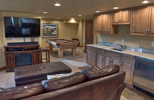 On the lower level, indulge in the expansive entertainment area, featuring a wet bar, pool table, air hockey table, and a massive flat-screen TV. Step outside to the private patio, where the hot tub awaits – the perfect spot to relax under the stars after a day of mountain adventures.