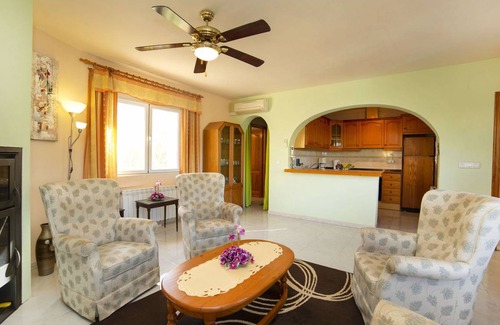 This 4-room house has a cozy 140 square meter floor plan with a living/dining room equipped with satellite TV, digital TV, international TV channels, air conditioning, fan, and forced-air heating. The living/dining room opens to a veranda, while the dining room also features air conditioning and forced-air heating. There are two bedrooms: one with a French bed (180 cm) and another with a French bed (150 cm). The open kitchen comes fully equipped with an oven, dishwasher, 4 ceramic glass hob hotplates, microwave, and electric coffee machine.