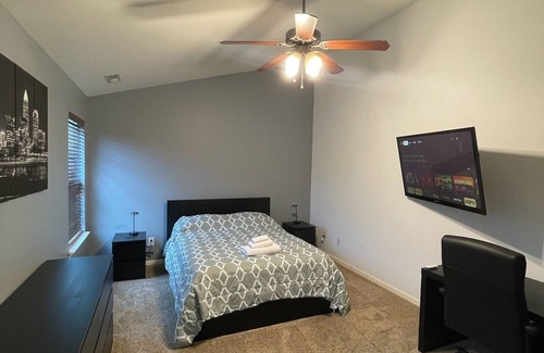 Welcome to our tranquil Vrbo! Our expansive home features high ceilings, ample windows, and an open floor plan that invites an abundance of natural light. With its modern furnishings and a comfortable bed, it provides the ideal setting for relaxation and rejuvenation. You'll have access to a house with shared common areas and have your own private room equipped with reliable Wi-Fi, making it well-suited for both remote workers and concert enthusiasts alike.