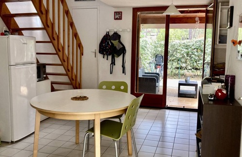 It consists on the ground floor of a living room with open kitchenette, a living room opening onto the terrace, a bathroom, separate toilets,. Upstairs 2 bedrooms with double beds 140 cm and a mezzanine with 2 beds 90 cm. Outside, a large terrace with a covered part facing the forest of Bombannes. It is located in peace. Deposit to be paid on site, holiday vouchers accepted.