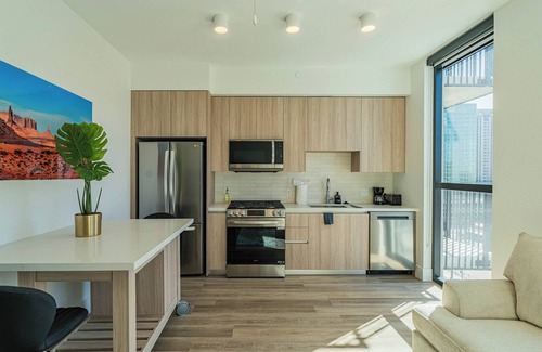 Stay where style meets comfort! This modern 1BR/1BA offers full access to amazing amenities, two pools, rooftop kitchen & lounge, gym & sauna, gaming area, and even a dog park & pet spa! Walk to downtown spots or relax and recharge above the city lights.