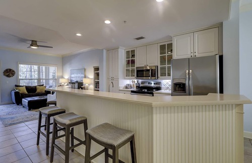 This tastefully appointed villa has tile floors in the living areas and wood flooring in the bedrooms. The living room has a sleeper sofa with 2 swivel rocking chairs, flat screen TV, sound bar, DVD and door to the patio. The fully equipped kitchen has a large table with 2 benches on each side with seating for 8. The coffee maker is a combo pod and filter coffee maker.