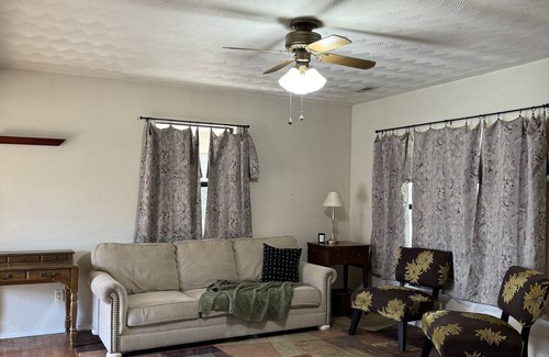 2 bedroom 1 1/2 bath home with sleeping for 6 in rural Bollinger County. Small kitchen/dining is open to living room. Down a short hall is bathroom and two bedrooms. Queen bed in bedroom 1 and twin beds in bedroom 2. Living room has pull out bed also. Large backyard with no other homes near by.