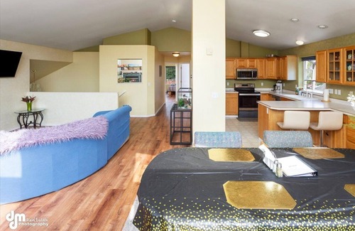 Relax with the whole family at this quiet 2-bedroom, 2-bathroom vacation home with a well-equipped kitchen, Yoga bed, and 55-inch TV entertainment. It is 2 miles away from Alaska Zoo and Golf Course, 3 miles away from Potter Marsh Wildlife Viewing Boardwalk, and Anchorage Diamond Shopping Center. A perfect place to experience Alaska's unique urban and natural attractions, the Alaska native crafts, stage dances, Chugach mountain, and the opportunities to see Northern Lights.