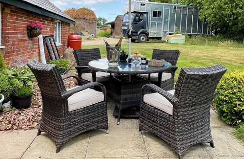 Shower Room: Cubicle Shower, Heated Towel Rail, Toilet. Electric central heating, electricity, bed linen, towels and Wi-Fi included. Welcome pack. Garden patio. Private parking for 2 cars. No smoking.. This charming two-bedroom converted piggery features a spacious open-plan kitchen, living, and dining area, the home showcases stunning exposed oak beams and solid oak flooring, creating a warm and inviting atmosphere. Large windows fill the space with natural light, enhancing the sense of openness and connection to the countryside surroundings. Lovingly restored, the property retains original features while offering modern amenities for year-round comfort. Ideal as a peaceful rural retreat, this unique home offers a rare opportunity to enjoy stylish, character-filled living in a beautiful and tranquil setting in a delightful part of the New Forest.