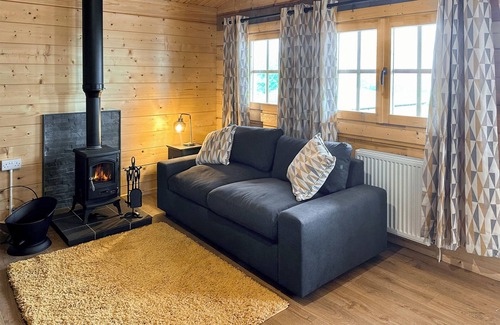 We love the warm cosy feeling of this charming log cabin, set on a hill with panoramic views stretching over hills and sea, taking in views of Morecombe Bay and across to the Isle of Man.. All on the Ground Floor:
