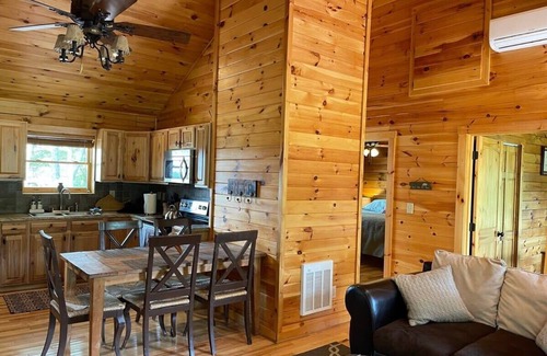 * 2-bedroom, 1-bath log cabin, hardwood floors, vaulted ceilings, and a wood-burning stone fireplace. 720 sq feet living space in cabin. 1 king bed. 1 queen bed in guest bedroom. (Top bunk-bed has been removed).
