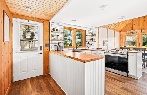 This newly renovated 2 bedroom, 2 bathroom cabin offers a stunning private waterfront with dock on 1.82 acres. The main floor bedroom has a California king bed, large flat screen tv, desk area and an attached bathroom. The 2nd bedroom boasts a lofted twin bed with a fun slide to get down, a twin over full bunk bed, a fun kids play area with tv and a dreamy attached bathroom with a soaking tub.