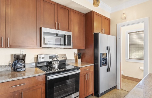 Each unit has 3 master suites, complete with 3 private baths and a 1/2 bath. 2 full kitchens , and each ground floor Suite has a kitchenette with Refrigerator.