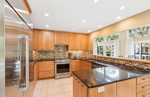 With a pass-through window to the dining room, the fully-equipped kitchen is roomy and has been remodeled with black granite countertops, new cabinetry, and stainless steel appliances. There is a breakfast table for 4 that also overlooks the pool. The foyer bathroom is nearby, as well as a laundry room with full-sized washer and dryer & plenty of counters and cabinets.