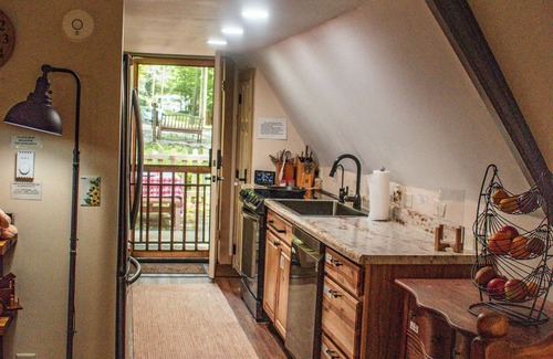 Inside, the 1000 sq. foot A-frame is warm, welcoming, and thoughtfully furnished with all modern comforts, including memory foam beds (sleeper sofa, too), blackout curtains for restful sleep, and a well-equipped kitchen.
