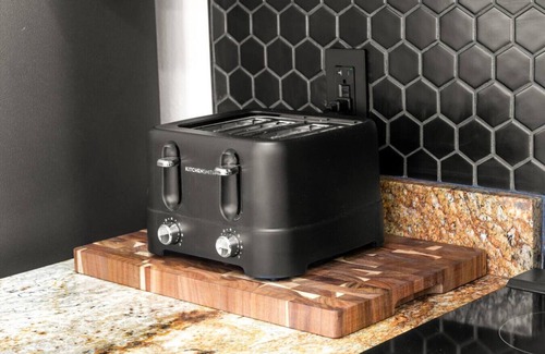 The third floor hosts both bedrooms, each with its own private en suite bathroom and a combination tub and shower. The master bedroom boasts a king-size ultra-plush memory foam mattress, while the guest bedroom offers a comfortable queen. Both rooms feature 65-inch QLED Smart TVs with Bose soundbars, along with dressers, luggage racks, and complementary hangers to make you feel right at home. For added convenience, an LG tower laundry center is also located on this floor for in-unit washing and drying.