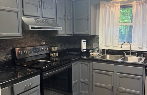 Sleeping up to 4 guests, the home offers 1 King bed and 2 Twin beds, along with 2 TVs and cozy living spaces for everyone to enjoy. The living room features a luxurious leather recliner sofa and loveseat—perfect for kicking back and catching a movie on the flat-screen TV with a premium sound system (and maybe sneaking in a nap or two!).
