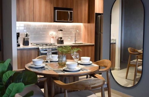 Department with: - 2 bedrooms: 1 with Queen Size bed and 1 single bed - 1 sofa bed Queen Size - 1 full bathroom - Fully equipped kitchen - Dining room for 4 people - 4K television - Hotel quality sheets - Basic appliances - Water filter - Griddle - Modern decoration In the building there are fun amenities such as: - Fully equipped gym - Inspiring co-working area - Outdoor games for children - Karaoke - Food Labs - Grills - Ping Pong Tables - Billiard Tables