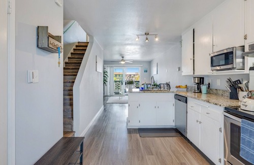 Feel the breeze coming off the ocean from one of the two outdoor balconies. The main balcony off the living room has a ocean view looking out at the famous OB Pier. The second is a wrap around balcony curated to help you un-wind the it's the perfect spot to practice your downward dog, while inhaling that rejuvenating sea air. The condo has two large bedrooms , one with a private workspace , high speed internet, printer, mouse, key board and monitor. The pool is a salt water heated pool.