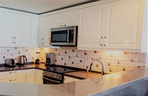 The Master en suite bedroom has a king size bed, with the second bedroom set in a King format. Master en suite bathroom includes a large bathtub for the perfect relaxing experience, a shower, illuminated mirrors, hairdryer and a double vanity. 2nd en suite bath has a large walk-in shower, illuminated mirrors, hairdryer and vanity. The 1/2 bathroom is located in the hallway from/to the living room/kitchen areas.