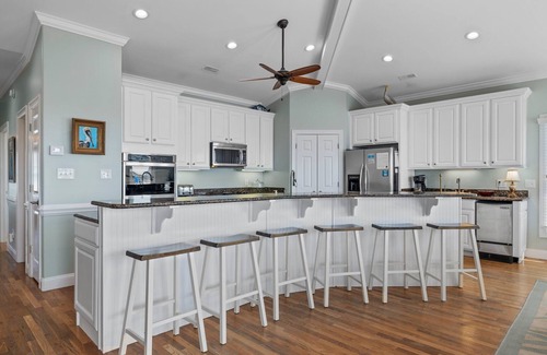 Heading up to the next level your eyes will first land on the panoramic views just out the wall of windows ahead. The open concept offers plenty of space either around the dining table, kitchen bar, or lounging in the adjacent living room. The kitchen is well equipped for any size group. Hiding behind the kitchen is the full sized laundry room, and half bath. The guest rooms on this level both offer private baths and are furnished with King and Double beds. Upon arrival you can rest assured that all of the beds have been made with Spinnaker’s Fresh Bed Promise.