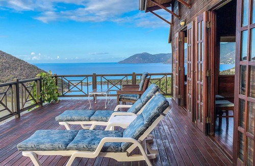 Arawak House is a traditional Caribbean style wooden house located above Smuggler’s Cove offering guests one of the most spectacular views in the area. The outside deck and dining area feature a magnificent panoramic view over Long Bay to Cane Garden Bay, a bird’s eye view of Belmont Pond with its flamingos, to the incredible sunset vistas over Smuggler’s Cove and Jost van Dyke. A ten minute walk on a private path places you on the sand in Smuggler’s Cove. Gold Seal Certified by the BVI Tourist Board. Sleeps up to 9 people in 3 bedrooms.