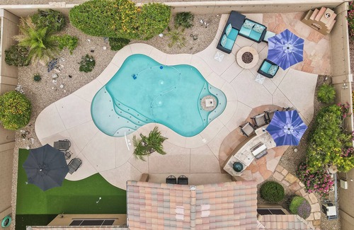 Get ready to relax in this 3-bedroom house in Goodyear. This wonderful property features 1 king bed and 2 queen beds, perfect for a family or group of friends. Enjoy the jetted bathtub, shower, and spacious walk in closet where a twin roll away is tucked away. Our place is equipped for both long or short stays to make your holiday one to remember. Outdoor area features a putting green, pool, built in fire pit and BBQ area with it's own mini fridge, Green Egg for the pit master in your group. A beautiful park across the street, and countless walking trails. Mountain biking within walking distance at Fins (Fantasy Island Single Track), Old Town Scottsdale 25 miles away. Come stay for spring training, The Goodyear Ballpark is just minutes away.