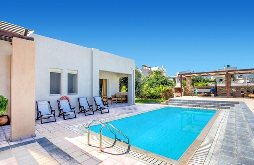 ED Refnr. 2901604 Villa Melia Villa Melia is a 3 bedroom villa with private pool, perched on a slight hill right at the center of the picturesque area of Istron with stunning sea and mountain view over the East coast of Crete. The villa is built in a modern architectural style, with a hint of the traditional in its stone brick walls and interior design. As part of the Nimfes Villas group, Villa Melia is neighbooring with two sister properties, Villa Akali and Villa Kallisto. The open plan living area has a mixture of classic and contemporary furniture with original artwork on the walls. There is a comfortable seating area, a flat screen TV and a dining table and chairs. The kitchen is well equipped with all modern appliances and is great for preparing your holiday meals. There is also a patio door leading to the pool area. Villa Melia has 2 twin bedrooms, one with an en suite shower room and the other has an en suite bathroom. There is also a double bedroom with an en suite bathroom and access to the pool area. All bedrooms are spacious and tastefully decorated. The private swimming pool is great for cooling off on those hot summer days and the raised terrace is ideal for admiring fantastic sea and mountain views. There is a shaded seating area next to the pool which is perfect for escaping the hot midday sun or reading a good book. You can also dine alfresco and cook up a feast on your own brick BBQ. The villa is accessed by a private entrance from the road. The short path leads directly to the front door through the garden and pool terrace. There is off-road parking available if you decide to hire a car. Licence number for tourism leasing: 1040K91002890201 Features of the property: Swimming pool depth: 137 m Outside area: Garden available; Grill; Private parking space; Private swimming pool; Swimming pool length: 823 m; Swimming pool width: 427 m; Terrace; House information: 2nd double bed; 2nd single bed; Bathrooms: 3; Bedroom; Detached building; Floor: 0; Property area: 140 m²; Living area: CD-Player; DVD-Player; Fireplace; Iron; Radio; Safe; Satellite-tv; Bath/WC: Bathtubs; Hairdryers; Shower; Toilet; Kitchen: Coffee machine; Dishwasher; Electric stove; Freezer; Fridge; Microwave; Oven; Toaster; Water boiler; Other: Air conditioning; Baby chair; Billard; Non-smoking object; Vacuum cleaner; View; Washing machine; Wifi all-inclusive package; Distances (linear, approx.): Distance Bar / Club: 50 m; Distance to beach: 50 m; Distance to lake: 7,00 km; Distance to sand beach: 50 m; Distance to the sea: 50 m; Next location: 7,00 km; Extra costs: - Energiekosten: im Preis enthalten . - Towels: included in price . - Final cleaning: included in price . - Bed linen: included in price . Additional information: - Property area: 140 m² - Distance to lake: 7 km