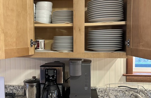 The fully stocked kitchen is a chef's dream, featuring a stove, oven, refrigerator, grill, microwave, dishwasher, coffee maker, kettle, kitchen island, toaster, and ice maker. Gather around the dining table and savor delicious meals prepared with the provided dishes and utensils.